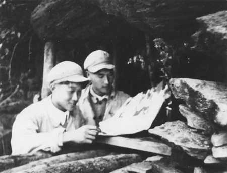 1951年抗美援朝第5次戰役期間,新華社記者李耐因隨軍(26軍)采訪,經常露營,寫稿子也常是在樹下、路邊或臨時搭起的棚子里。這是記者李耐因(右)在臨時搭起的防空棚下,向軍隊參謀人員請教戰況。