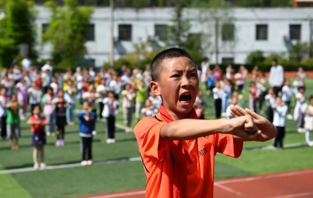 9月8日,在陜西平利老縣鎮(zhèn)中心小學(xué)的操場(chǎng)上,學(xué)生沈首洋(前)在大課間武術(shù)操上領(lǐng)操。新華社記者 李一博 攝