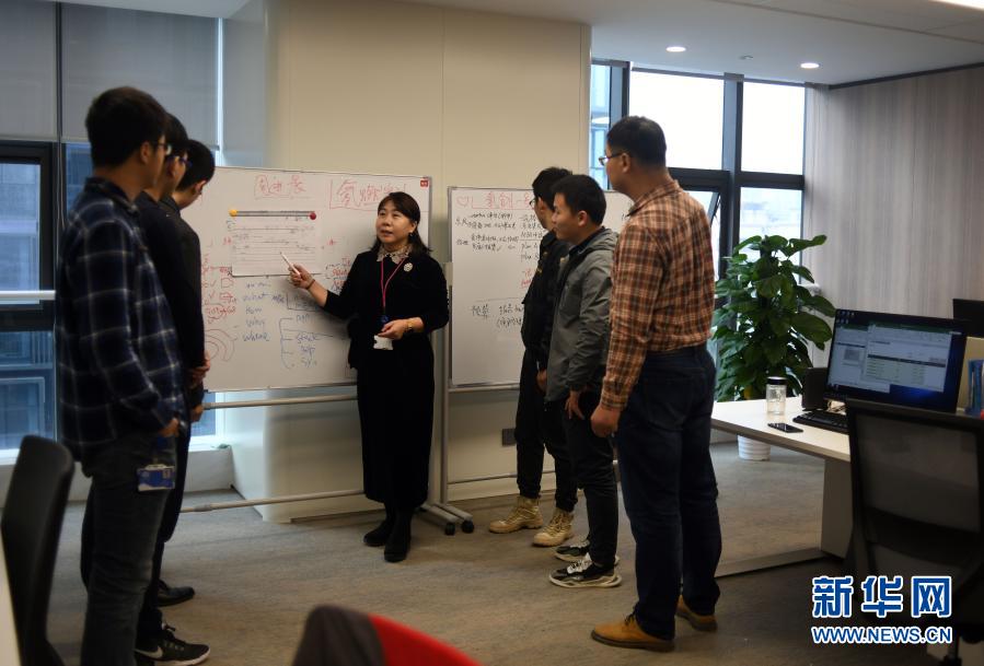 中汽創智科技有限公司燃料電池首席技術官王英(中)與同事交流(11月6日攝)。新華社記者 金良快 攝