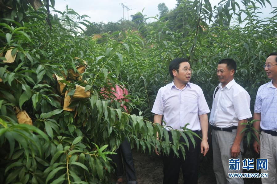 2011年7月,黃詩燕(右三)在霞陽鎮考察黃桃種植業。新華社發