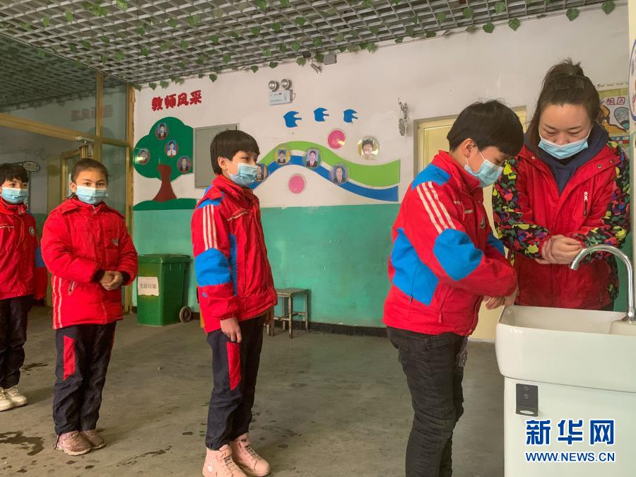 11月19日,在新疆阿克蘇市喀拉塔勒鎮尤喀克博孜其小學,教師耿琴(右一)幫孩子們洗手。新華社發