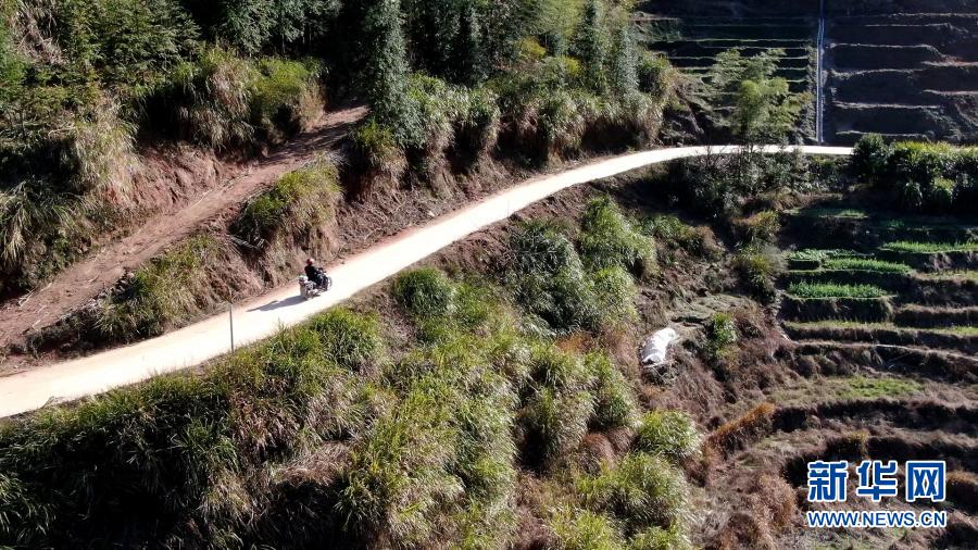 在江西省萬載縣高村鎮新竹村,新竹小學的校長羅長石騎行在山路上(2月17日攝,無人機照片)。他要去最偏遠的村組,給學生送當天的線上教學課程。新華社記者 彭昭之 攝