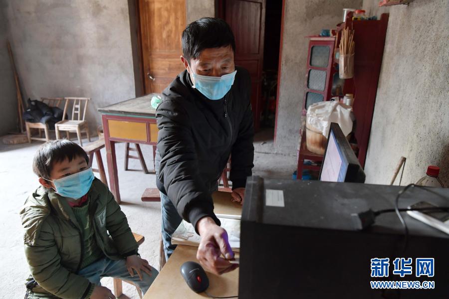 在江西省萬載縣高村鎮新竹村尹家嶺村組,新竹小學的校長羅長石在學生郭仕錢家中,為他拷貝當天的課程(2月17日攝)。新華社記者 彭昭之 攝