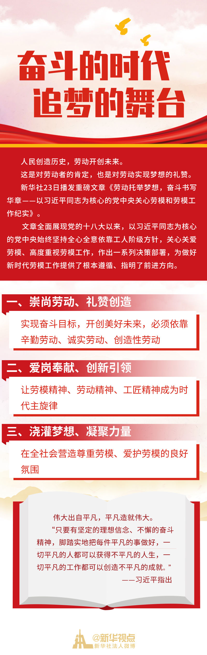 新華社23日播發重磅文章《勞動托舉夢想,奮斗書寫華章——以習近平同志為核心的黨中央關心勞模和勞模工作紀實》。