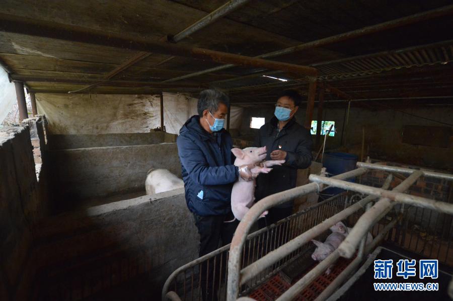 11月17日,范三林(左)與駐村扶貧工作隊(duì)隊(duì)長(zhǎng)張亮亮檢查仔豬生長(zhǎng)狀況。新華社記者 范世輝 攝