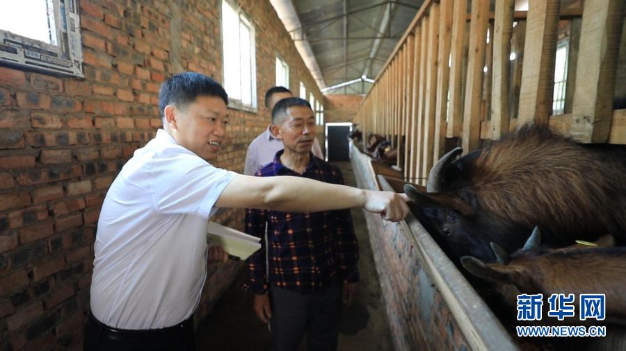 全國勞動模范、四川省南江五郎黃羊養殖專業合作社理事長汪其德(左一)在巴中市南江縣紅旗村村民家中指導養羊技術(資料照片)。新華社發