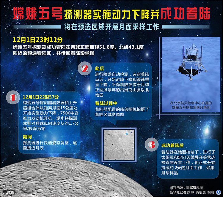 圖表:嫦娥五號探測器實施動力下降并成功著陸 將在預選區域開展月面采樣工作 新華社記者 陳琛 編制