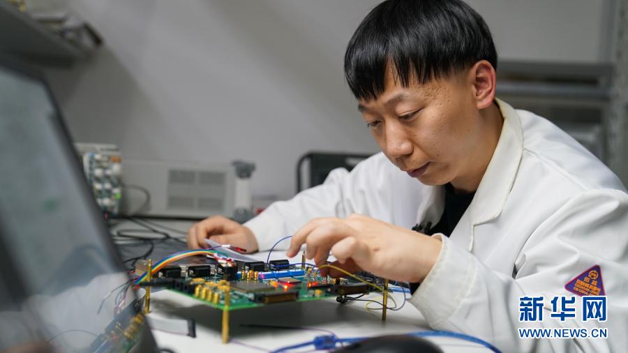 在中科院長春光機所,科研人員隋延林調試相位計數字電路板(11月25日攝)。新華社發(王帆 攝)