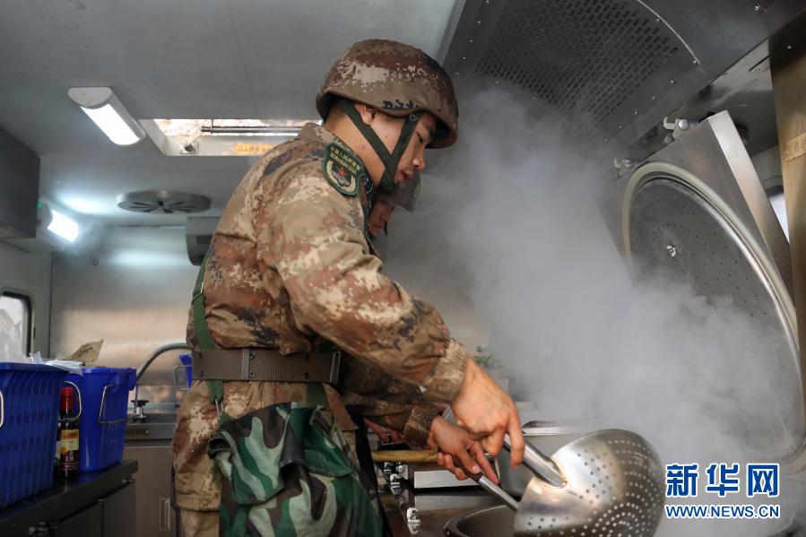 飲食保障隊(duì)參賽隊(duì)員在野戰(zhàn)炊事車內(nèi)加工制作野戰(zhàn)快餐(11月29日攝)。新華社發(fā)(呂冀周 攝)