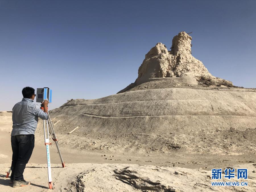 技術專家在樓蘭古城內使用三維激光掃描技術為佛塔遺址建立數字化檔案(10月20日攝)。新華社發