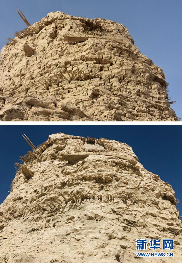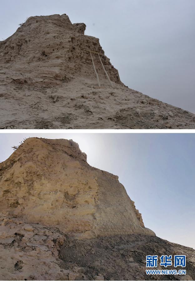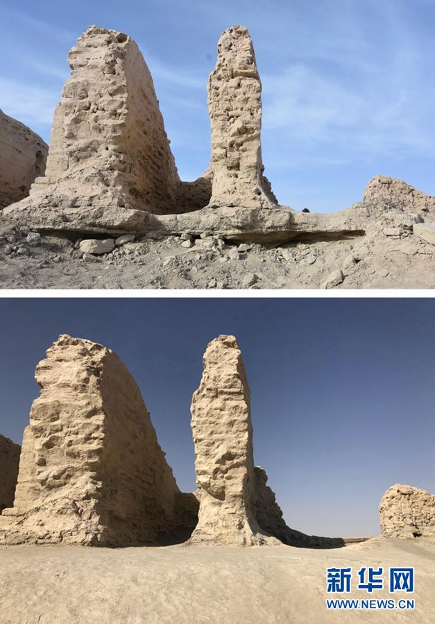 拼版照片:上圖為搶險加固前的三間房遺址局部(2019年11月14日攝);下圖為搶險加固后的三間房遺址局部(10月20日攝)。新華社發