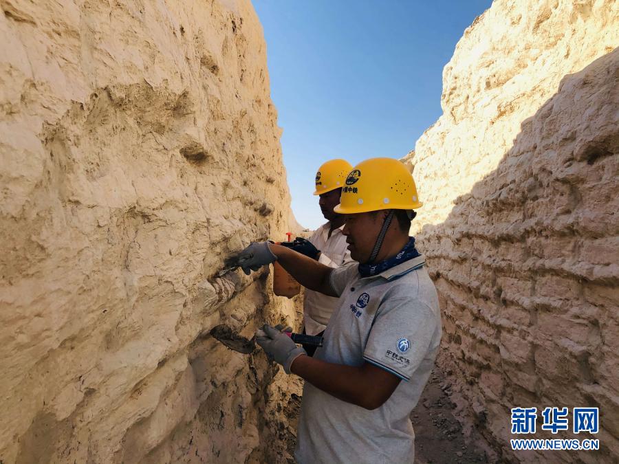 文物保護工作者在樓蘭古城內搶險加固三間房遺址(9月12日攝)。新華社發