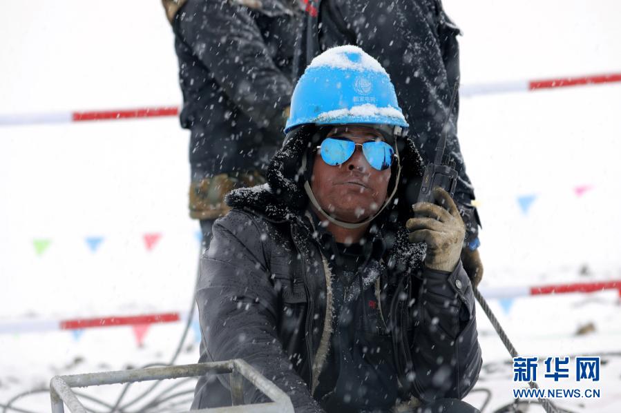 在西藏日喀則市定日縣,西藏阿里與藏中電網聯網工程線路4標段施工人員在風雪中作業(5月2日攝)。新華社發
