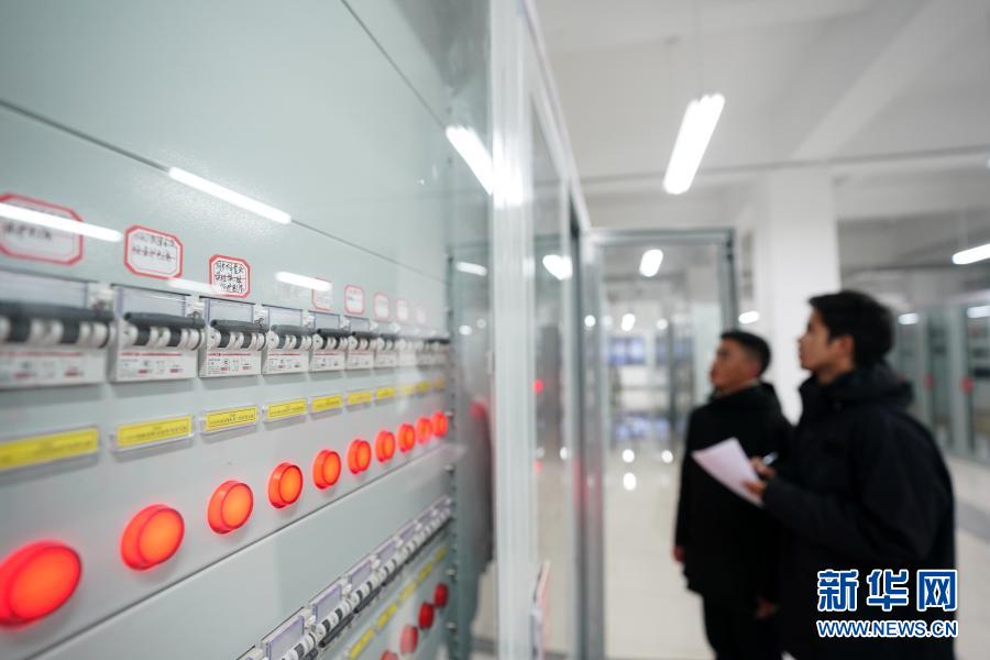 在西藏阿里與藏中電網聯網工程薩嘎220千伏變電站,工作人員查看設備運行情況(11月27日攝)。新華社記者 詹彥 攝