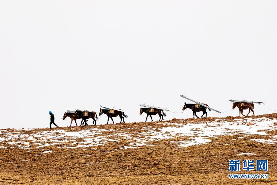 在西藏日喀則市拉孜縣與定日縣交界處的嘉措拉山上,施工人員用騾子向施工點運送材料(4月25日攝)。新華社發
