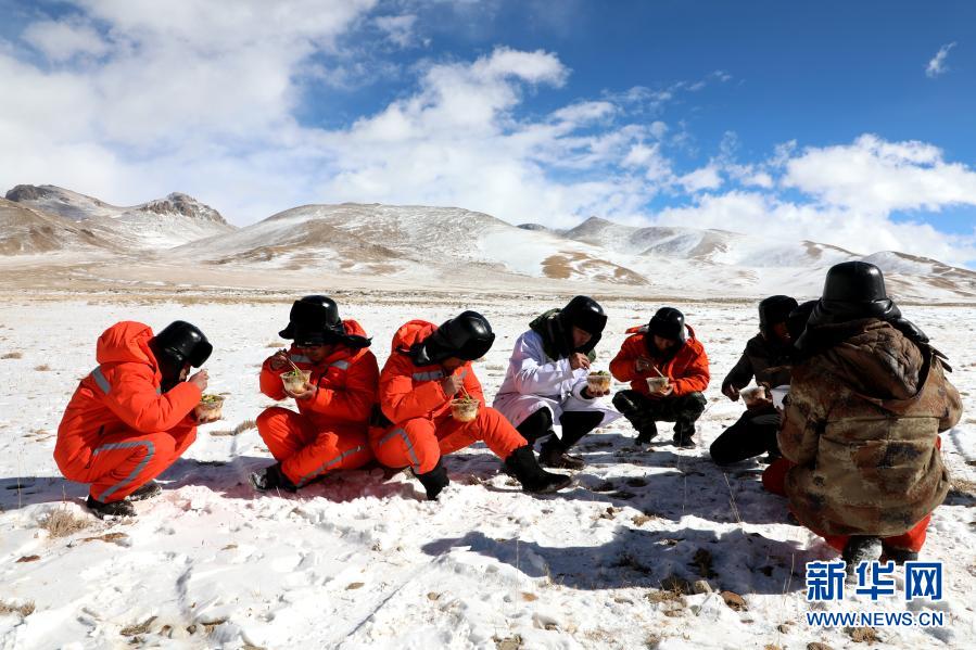 在西藏阿里地區噶爾縣,施工人員在西藏阿里與藏中電網聯網工程線路13標段吃午飯(2019年12月21日攝)。新華社發