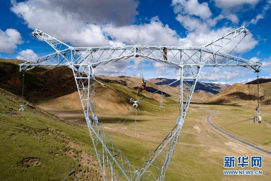 在西藏日喀則市定日縣,施工人員在西藏阿里與藏中電網聯網工程線路4標段作業(4月28日攝)。新華社發
