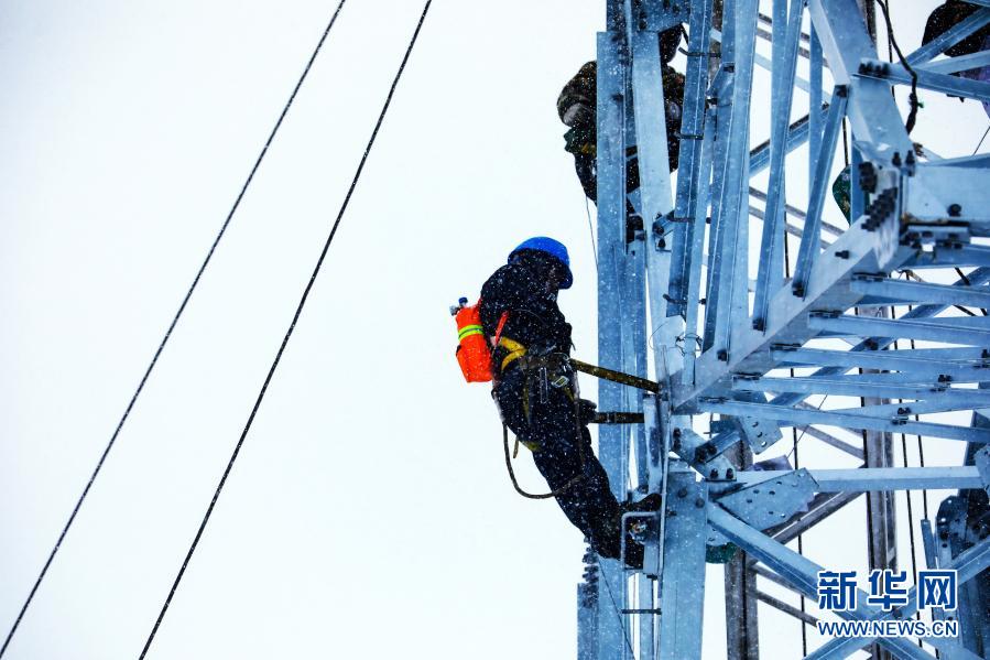 在西藏日喀則市定日縣,西藏阿里與藏中電網聯網工程線路4標段施工人員在暴風雪中作業(5月2日攝)。新華社發