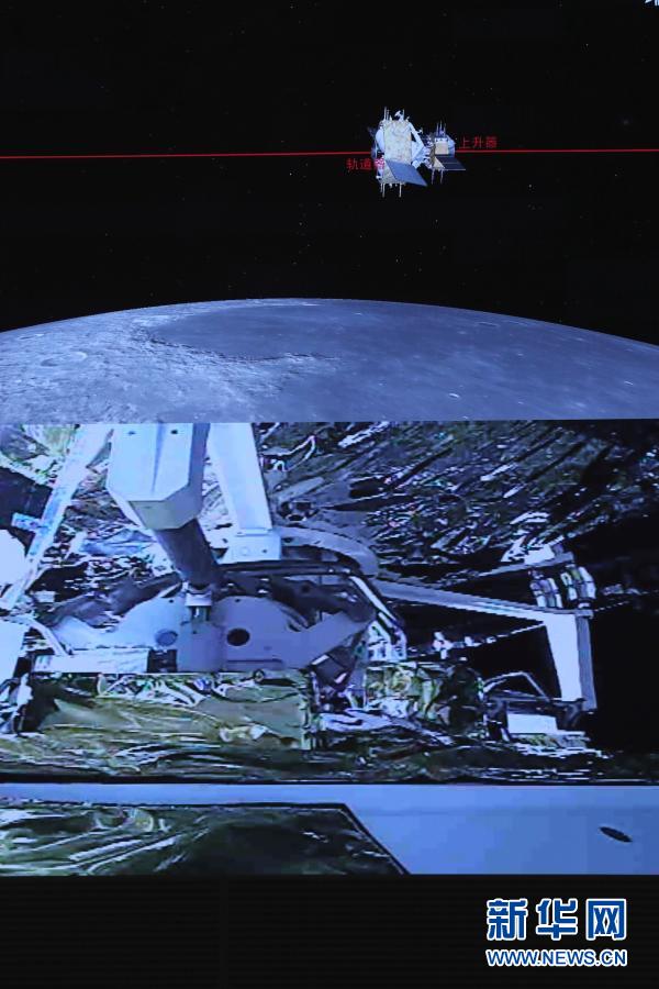 這是12月6日在北京航天飛行控制中心指揮大廳拍攝的嫦娥五號(hào)上升器與軌道器返回器組合體交會(huì)對(duì)接畫面。