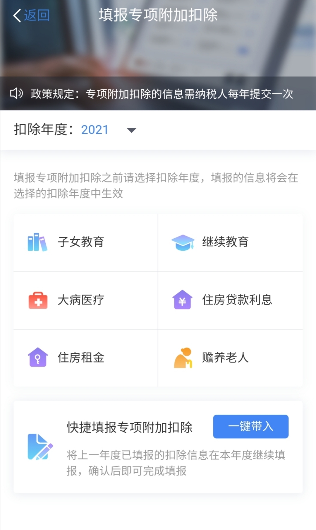 如何確認?納稅人從APP首頁進入“填報專項附加扣除”頁面后,既可以選擇一鍵帶入,即將上一年度已填報的扣除信息在本年度繼續填報,確認后即可完成填報,也可以按目前自身實際情況逐項填報。若未及時確認,那么已填報的扣除信息將自動視同有效并延長至2021年。