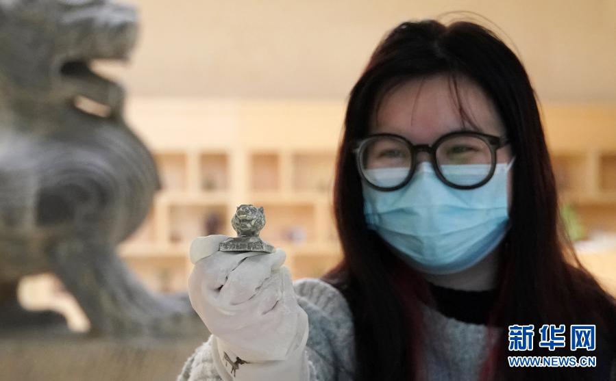 工作人員展示從“考古盲盒”中挖出的虎首印章文創產品(12月8日攝)。新華社記者 袁月明 攝