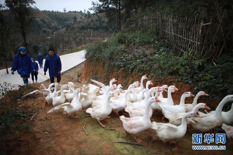 工作人員在貴州省黔東南苗族侗族自治州錦屏縣馬臺商品鵝養殖基地養鵝(12月8日攝)。新華社記者 劉續 攝