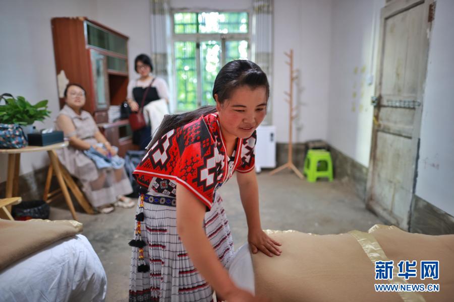 貴州省赫章縣河鎮鄉海雀村一家民宿的人員在整理房間(8月4日攝)。新華社記者 劉續 攝