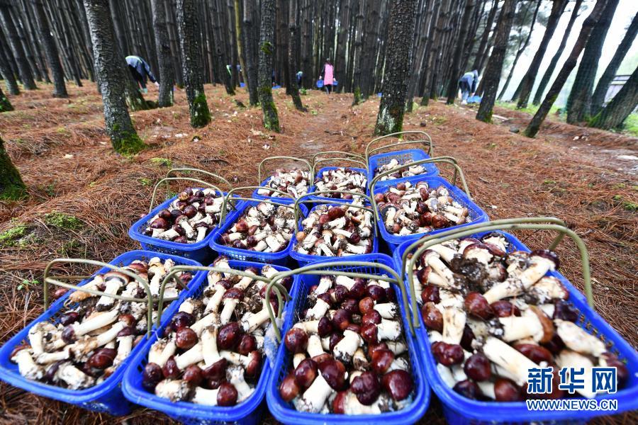 這是村民在貴州省威寧縣觀風海鎮沙子坡林場采摘的林下食用菌(6月18日攝)。新華社記者 楊文斌 攝