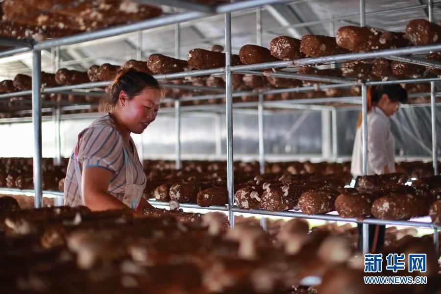 貴州省赫章縣河鎮鄉村民在香菇種植基地工作(8月4日攝)。新華社記者 劉續 攝