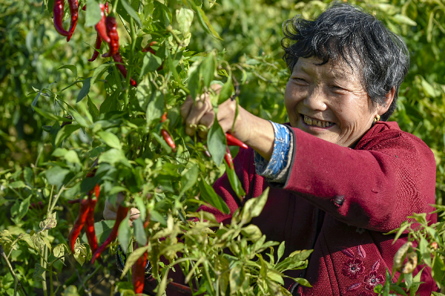 ????2018年拍攝于陜西興平桑鎮永流村,農民采摘辣椒,辣椒喜獲豐收,農民露出喜悅的笑容。(組照1)張綺云 攝