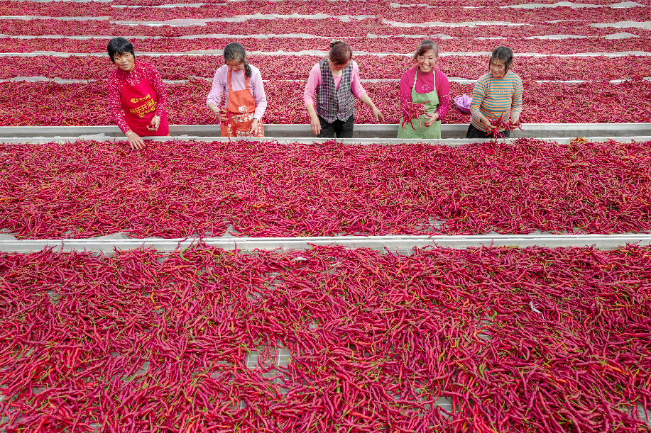 ??????2020年拍攝于陜西興平桑鎮西橋村金鵬辣蒜專業合作社,農民將辣椒揚起晾曬。(組照4)張綺云 攝