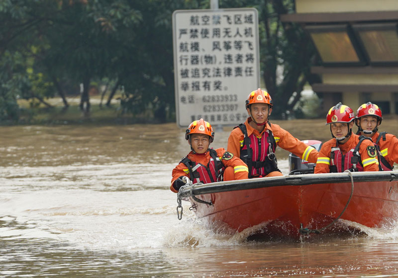 消防隊員駕駛救援船在被洪水淹沒的城市街巷中巡邏搜救。劉潺 攝