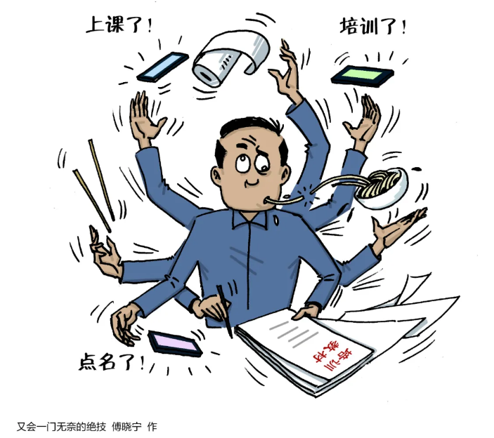 無獨有偶。在某事業單位工作的王智,剛結束為期一周的脫產學習,就得馬上完成單位安排的每周兩節視頻課的學習任務。王智說,突如其來的培訓打亂了原有的工作安排:“我只能在看視頻時抽空回復信息,特別緊急時干脆拿出電腦處理工作。”
