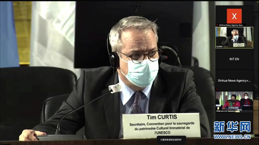 這張12月18日的視頻截圖顯示的是,聯合國教科文組織《保護非物質文化遺產公約》秘書蒂姆·柯蒂斯在法國巴黎參加線上視頻會議。新華社發