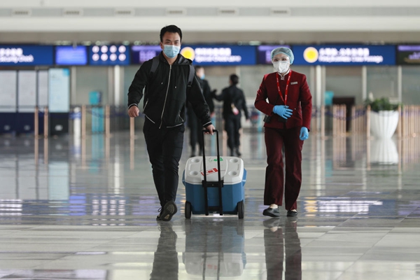 ▲ 2020年4月24日,武漢協和醫院心外科醫生盧雄豪(左)運送來自山東的供肺抵達武漢天河機場。疫情期間原定航班取消,移植團隊與中國國際航空公司聯系后,該公司緊急啟動綠色通道,重新開通此航班。新華社記者 沈伯韓攝