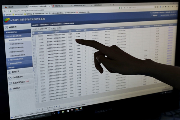 ▲ 在首都醫科大學附屬北京友誼醫院,一臺電腦顯示“中國人體器官分配與共享計算機系統”(COTRS)中的人體器官移植等待者預約名單。新華社記者 沈伯韓攝
