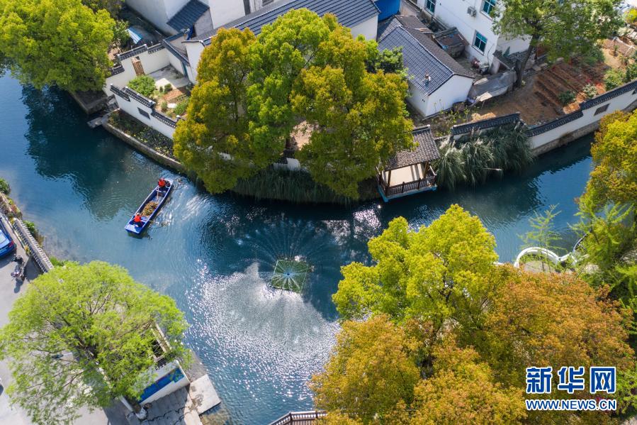 浙江省長興縣龍山街道渚山村,保潔人員進行日常河道護理巡查(4月9日攝,無人機照片)。新華社記者 徐昱 攝
