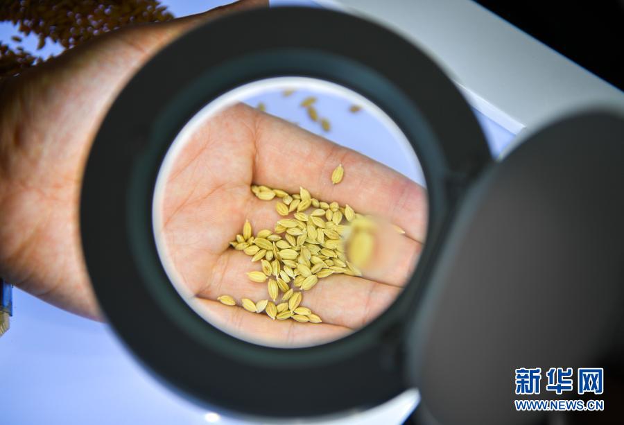 在吉林省吉林市永吉縣一拉溪鎮九月豐家庭農場,工作人員在實驗室中檢測一批試種水稻的稻谷外觀(8月12日攝)。新華社記者 許暢 攝