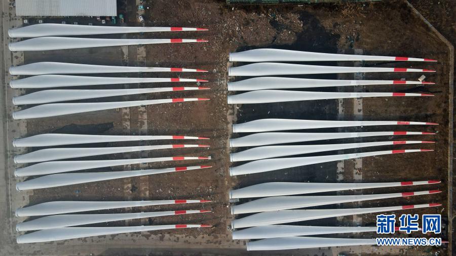 這是河北省威縣一家風電設施生產企業內的大型風電機組葉片(12月8日攝,無人機照片)。新華社記者 牟宇 攝