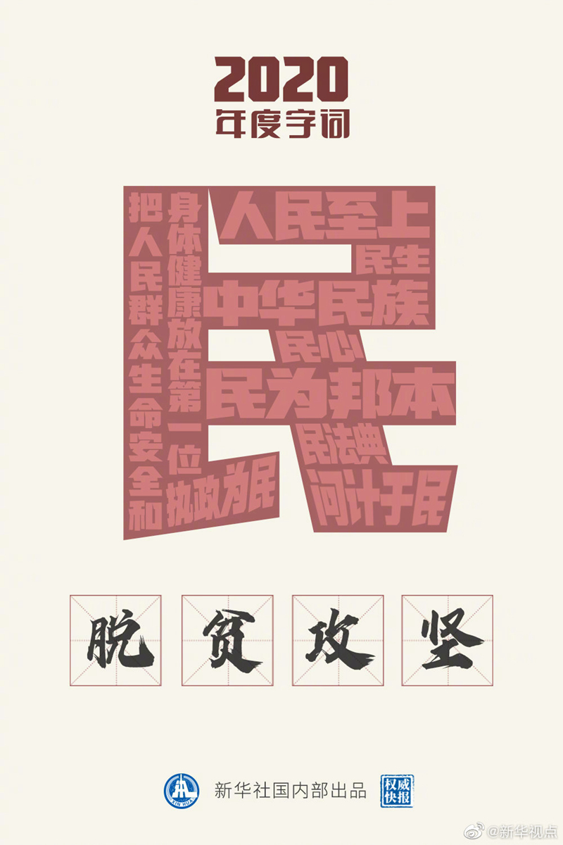 “民”當選2020年度“國內字”;“脫貧攻堅”當選2020年度“國內詞”。國家語言資源監測與研究中心、商務印書館等21日發布“漢語盤點2020”年度字詞,定格我國年度記憶。這一年,從抗疫抗洪到民法典誕生、謀劃開啟“十四五”新征程,處處閃耀“人民至上”理念;這一年,如期完成脫貧攻堅目標任務,千年夙愿,今朝夢圓!?