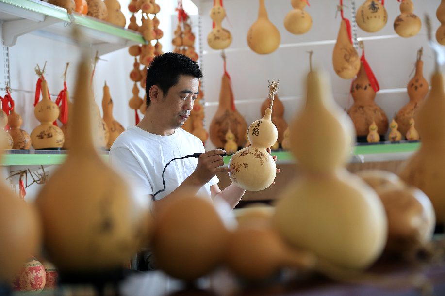 ????河北省邢臺市平鄉(xiāng)縣霍建龍,2014年因一起意外事故導致高位截癱。身殘志堅的他學習烙畫葫蘆藝術,實現脫貧致富,并創(chuàng)辦了殘疾人烙畫葫蘆社,帶領其他殘疾貧困群眾脫貧致富。圖為霍建龍整理葫蘆作品。 柴更利 攝