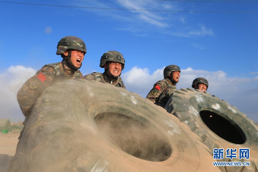 武警新疆總隊某機動支隊特戰一中隊組織官兵進行翻輪胎體能訓練(10月30日攝)。新華社發(張文 攝)