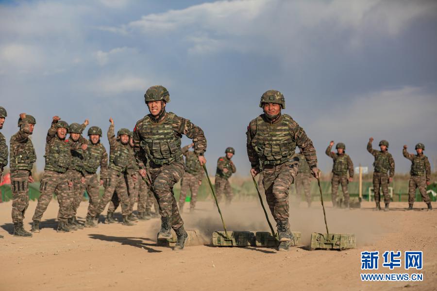 武警新疆總隊某機動支隊特戰一中隊組織官兵進行搬運子彈箱體能訓練(10月30日攝)。新華社發(張文 攝)