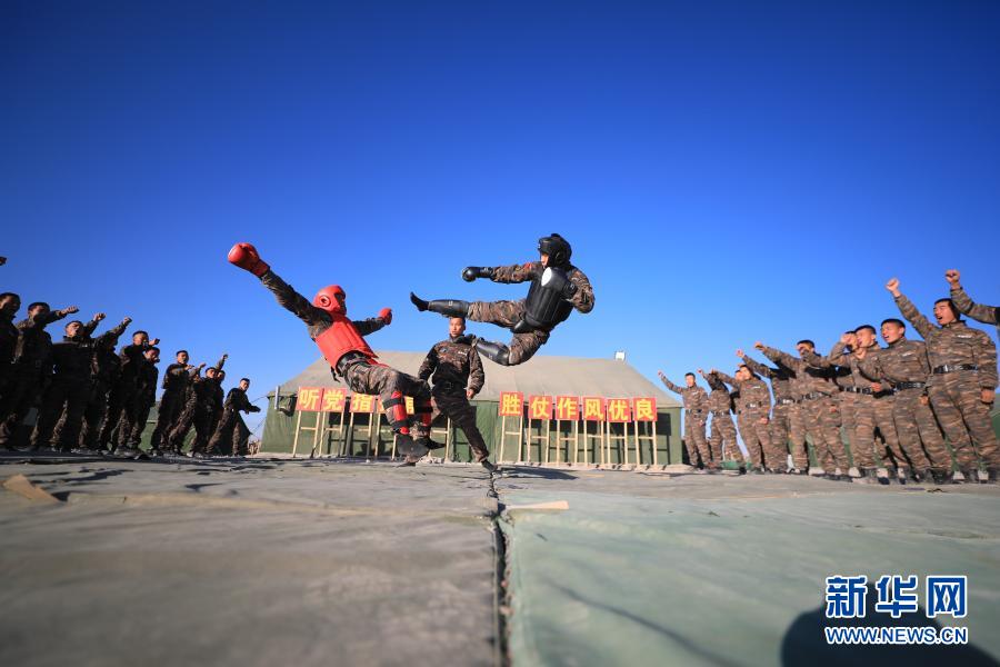 武警新疆總隊某機動支隊特戰一中隊組織官兵開展搏擊訓練(10月31日攝)。新華社發(張文 攝)