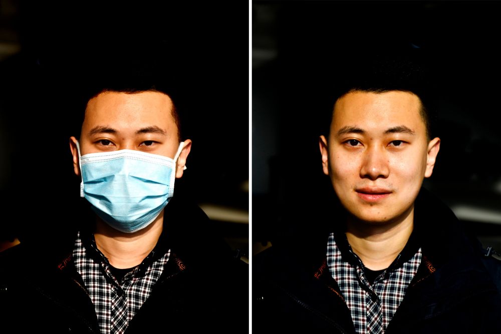 他習慣戴著醫用口罩。黑色的棉夾克內有方格襯衫打底,卡其色的休閑褲配一雙藍色的運動鞋,顯得既穩重又有朝氣。