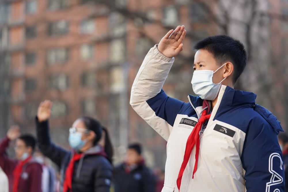??12月21日,在北京四中廣外校區,蔡昊霖(前)和同學一起參加升旗儀式。