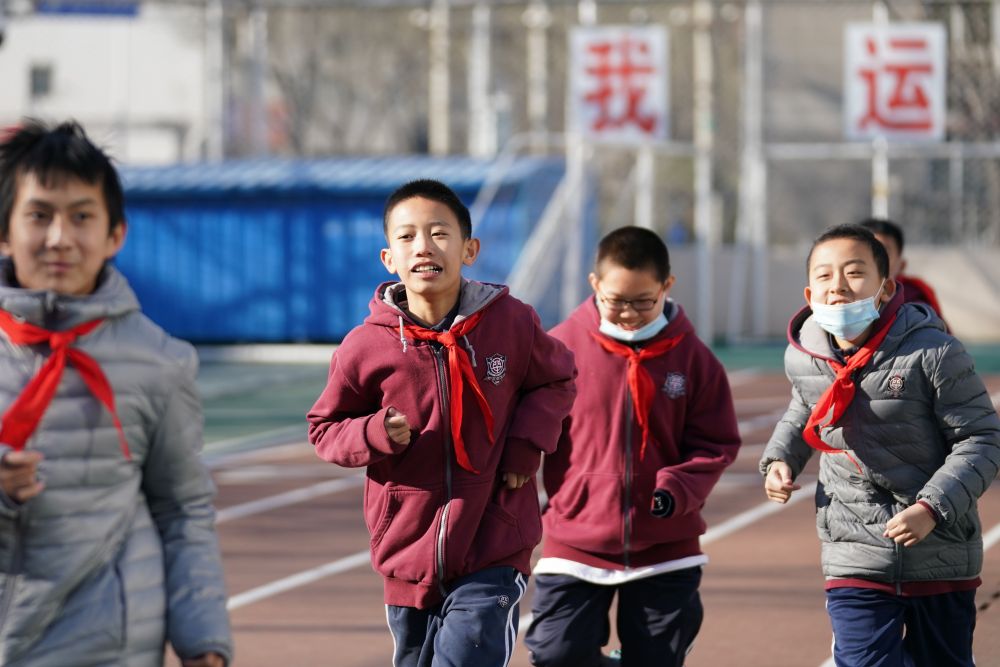 ??12月21日,在北京四中廣外校區,蔡昊霖(左二)和同學一起上體育課。