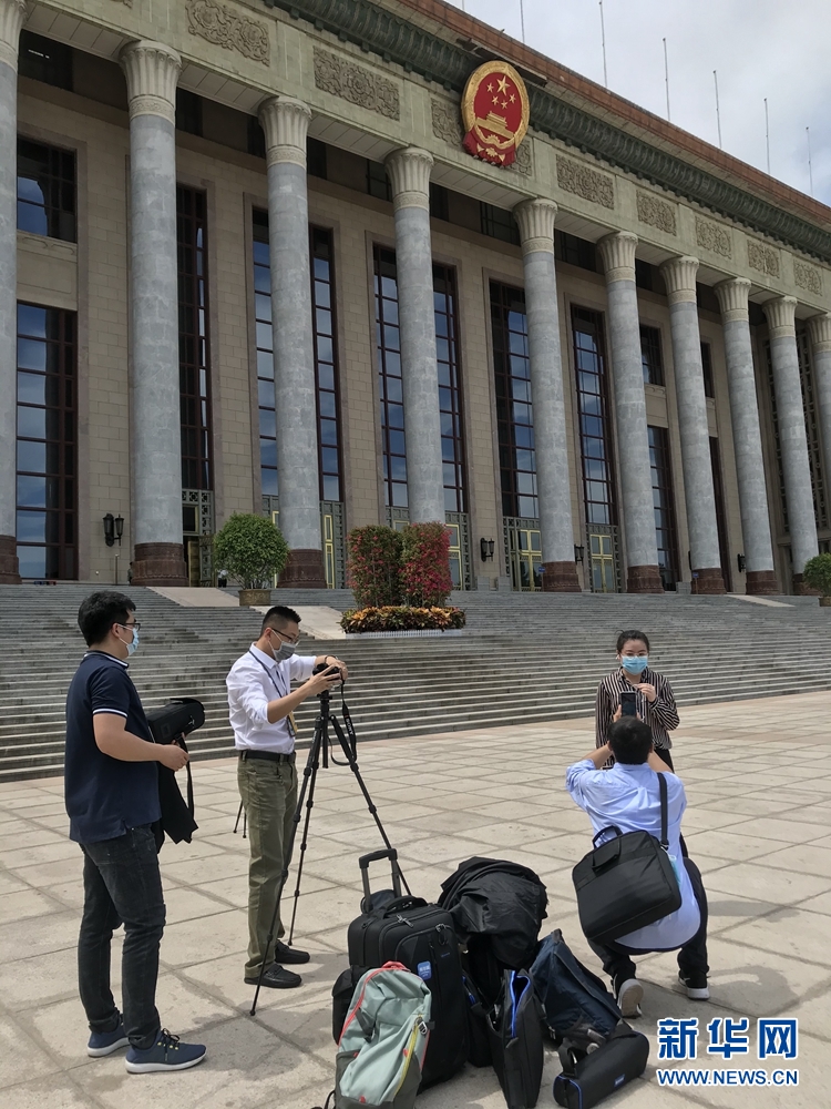 5月20日,全國政協十三屆三次會議召開新聞發布會。大會新聞發言人郭衛民向中外媒體介紹本次大會有關情況并回答記者提問。圖為本網記者在人民大會堂東門外廣場做直播前準備工作。新華網記者 周紅軍? 攝