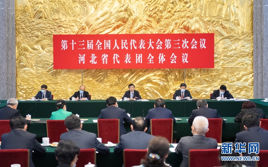 5月22日,中共中央政治局常委、中央書記處書記王滬寧參加十三屆全國人大三次會議河北代表團的審議。 新華社記者 翟健嵐 攝
