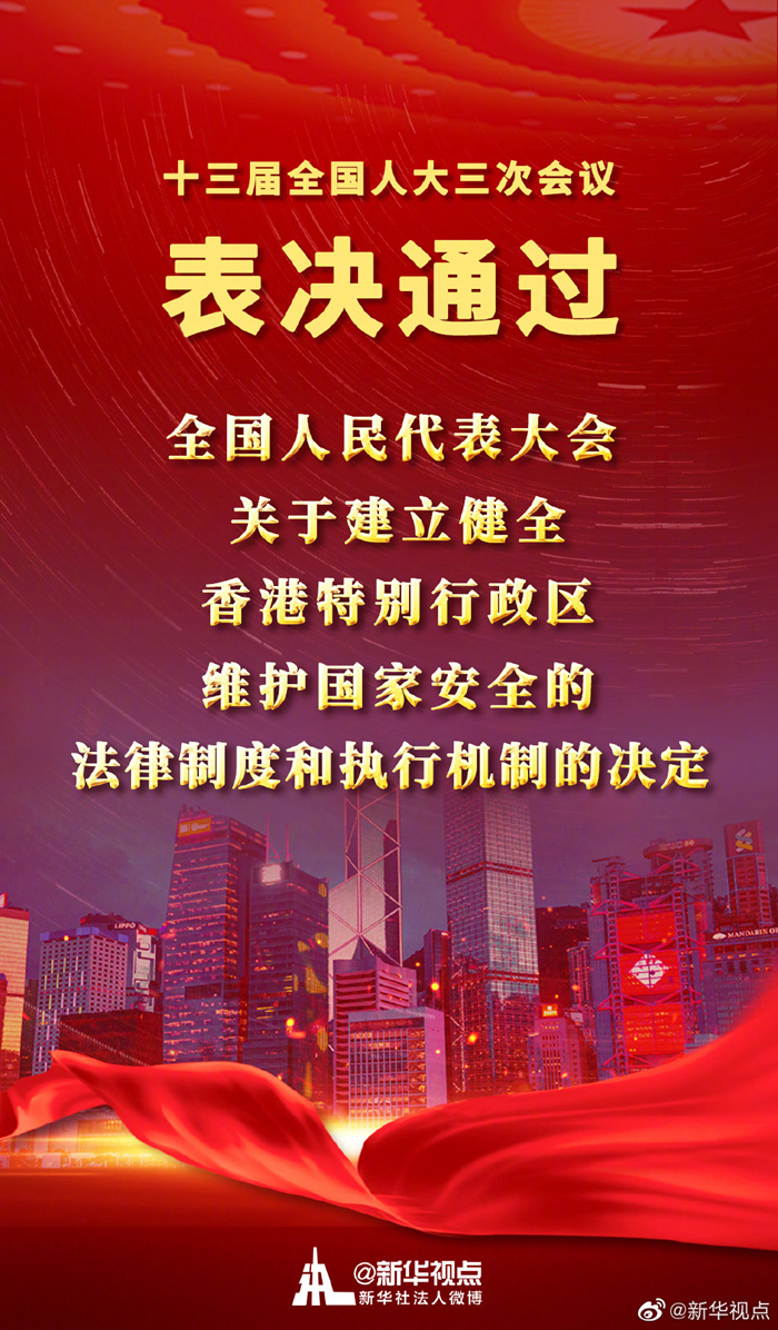 十三屆全國人大三次會議表決通過了全國人民代表大會關于建立健全香港特別行政區維護國家安全的法律制度和執行機制的決定-新華網